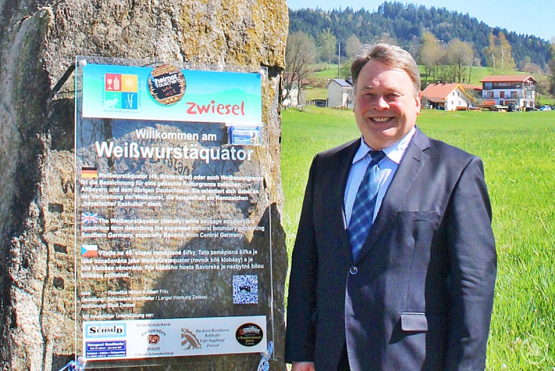 Anläßlich seines Besuches zur Eröffnung "Schaufenster der Region" am ehem. Infozentrum ließ es sich Staatsminister Helmut Brunner nicht nehmen, auch dem bayernweit einzigen Weißwurstäquator Denkmal seine Referenz zu erweisen. Gut 30 Meter vom Arberland-Schmankerl-Schaufenster entfernt postierte sich der Minister neben das Denkmal für ein Photo und zeigte sich erfreut über dieses gefällige Monument am Ortseingang der Glasstadt. Im Herbst 2013 wurde das Weißwurstäquator Denkmal exakt auf dem 49. Breitengrad (Weißwurstäquator) feierlich enthüllt und Zwiesel machte somit als einzige Kommune in Bayern den berühmten Äquator erstmals für alle Besucher sichtbar.