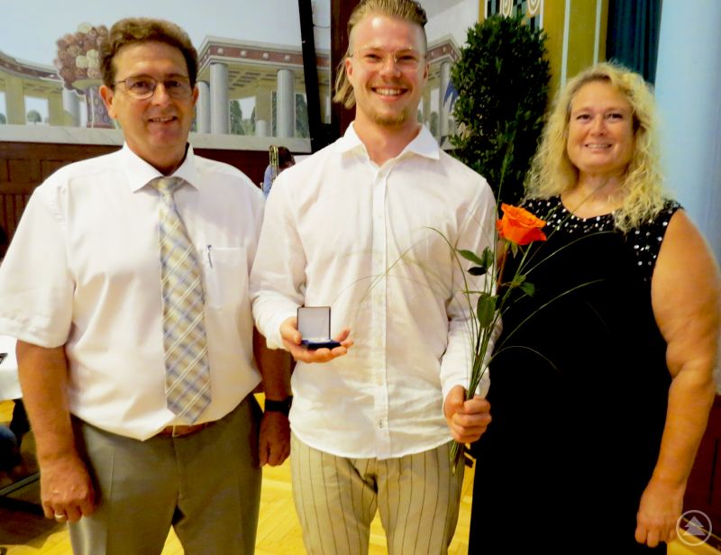 Besonders stolz konnte Timo Haas-Guder als Prüfungsbester über sein Prüfungsergebnis mit dem Notendurchschnitt 1,33 sein. Werner Beham überreichte ihm als Anerkennung eine „Silbermedaille“ – eine Silver-Eagle-Münze.