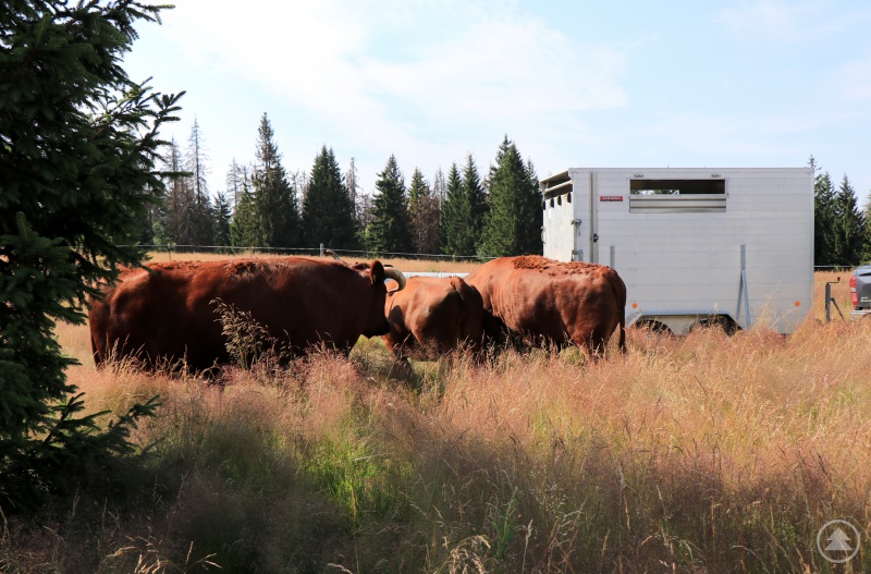 „Auch wenn wir das jedes Jahr machen, sind wir im Vorfeld tatsächlich immer wieder ein wenig nervös“, gibt Tierpfleger Max Schreder zu, der den Transport der Tiere in diesem Jahr koordiniert hat. „Man weiß nie ob das Verladen der Rinder klappt, für die ist das schließlich auch nichts Alltägliches.“ Mit viel Ruhe und Geduld haben es die Nationalparkmitarbeiter aber am Ende geschafft, die insgesamt zehn Tiere in Hänger zu verladen und zum Ruckowitzschachten zu transportieren. Die saftigen Wiesen im Tal haben sie für die nächsten Monate also mit den artenreichen Weiden auf den Hochlagen rund um den Großen Falkenstein getauscht. „Die ersten Wochen sollen Sie den Ruckowitzschachten, den größten Schachten bei uns im Park, abweiden, danach kommen die Tiere noch auf dem Hochschachten zum Einsatz“, sagt der erfahrene Tierpfleger.