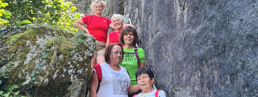 Rita Hagl-Kehl (oben) und Brigitte Grantner (Mitte) mit einem Teil der Wandergruppe am Rand der Burganlage Ranfels.