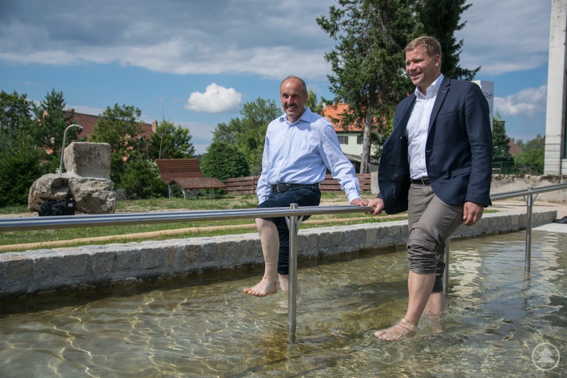 Eine kleine Erfrischung an einem heißen Sommertag: Bezirkstagspräsident Dr. Olaf Heinrich (r.) konnte nicht widerstehen, gemeinsam mit Bürgermeister Heinz Scheibenzuber das neue Kneippbecken am Dorfplatz zu testen.