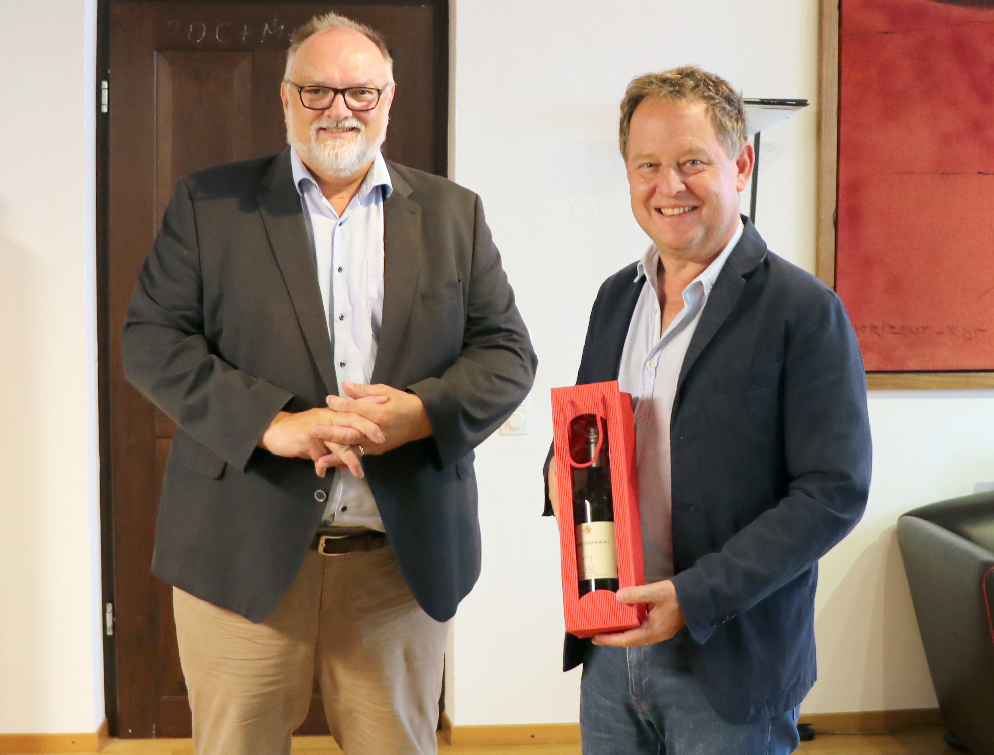 Burghausens Erster Bürgermeisters Florian Schneider (rechts) freut sich über Oberbürgermeister Jürgen Duppers Gastgeschenk in Form eine Flasche Stiftswein.