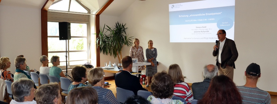 Stellvertretender Landrat Franz Brunner begrüßt die Teilnehmer und die Referentinnen Johanna Myllymäki und Simona Sandl von der Fachstelle Demenz und Pflege Niederbayern (v.r.).