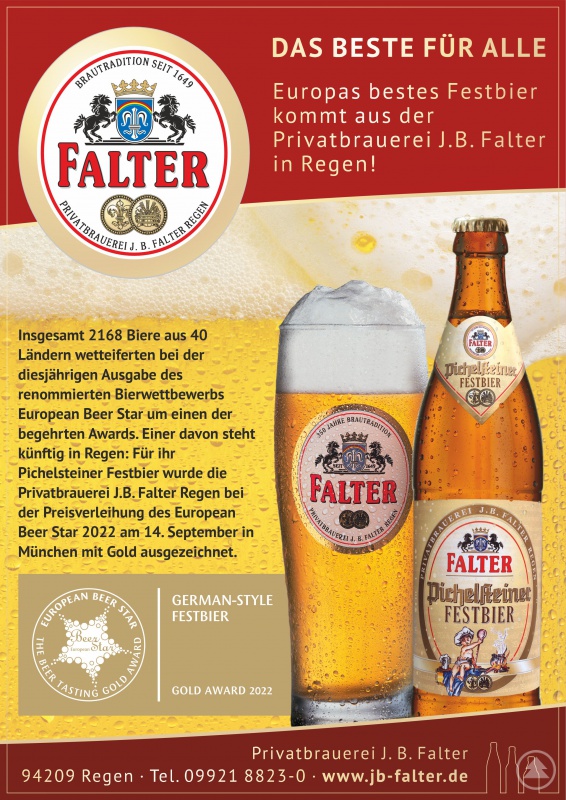 Insgesamt 2168 Biere aus 40 Ländern wetteiferten bei der diesjährigen Ausgabe des renommierten Bierwettbewerbs European Beer Star um einen der begehrten Awards. Einer davon steht künftig in Regen: Für ihr Pichelsteiner Festbier wurde die Privatbrauerei J. B. Falter Regen KG bei der Preisverleihung des European Beer Star 2022 am 14. September in München mit Gold ausgezeichnet.