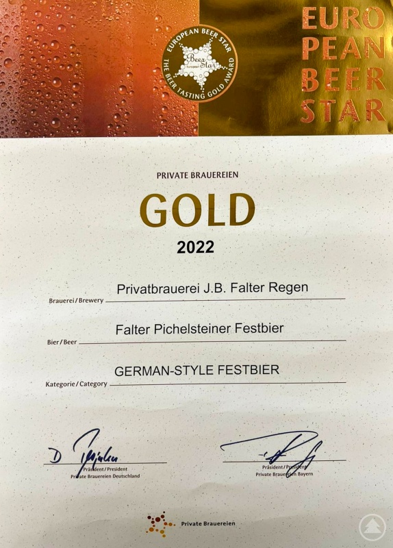 Ebenfalls hohe Maßstäbe setzte die Privatbrauerei J. B. Falter Regen KG: „Unser Pichelsteiner Festbier konnte vor einer international besetzten Expertenjury bestehen und sich gegen zahlreiche weitere Biere durchsetzen. Der Gold-Award zeigt, dass unser Pichelsteiner Festbier zu den besten Bieren der Welt gehört!“, freut sich auch Braumeister Martin Stadlöder über die Auszeichnung beim European Beer Star 2022.