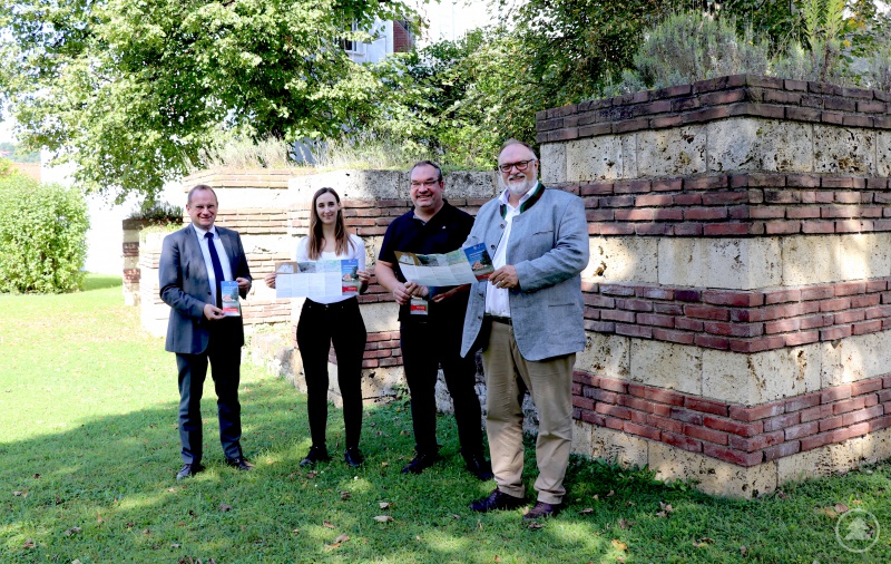 Oberbürgermeister Jürgen Dupper (v. r.), Stadtarchäologe und Museumsleiter Dr. Thomas Maurer, Museumsmitarbeiterin Veronika Valouchová und Kulturreferent Dr. Bernhard Forster präsentieren den neuen Flyer.