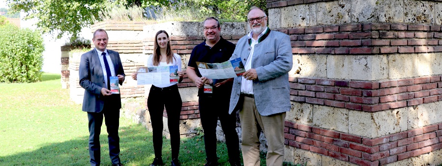 Oberbürgermeister Jürgen Dupper (v. r.), Stadtarchäologe und Museumsleiter Dr. Thomas Maurer, Museumsmitarbeiterin Veronika Valouchová und Kulturreferent Dr. Bernhard Forster präsentieren den neuen Flyer.