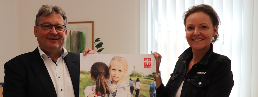 Die Caritasvorstände, Mag.a (FH) Andrea Anderlik, MSc, und Diakon Konrad Niederländer machen mit dem Plakat zur Herbstsammlung deutlich, dass Nothelfer gesucht sind, die sich solidarisch einsetzen.