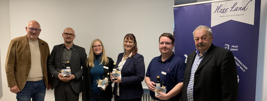 Der 1. Vorsitzende des Ilzer Landes Werner Weny (1.v.r.) und MdL Manfred Eibl (1.v.l.) überreichten den Referenten Michael Haderer (Thomas Krenn AG, 2.v.l.), Tina Johnscher (Bayern Innovativ, 3.v.l.), Elke Büttner (Bayern Innovativ, 3.v.r.) sowie Robin Hesch (Bayern Innovativ, 2.v.r.) ein kleines Geschenk.