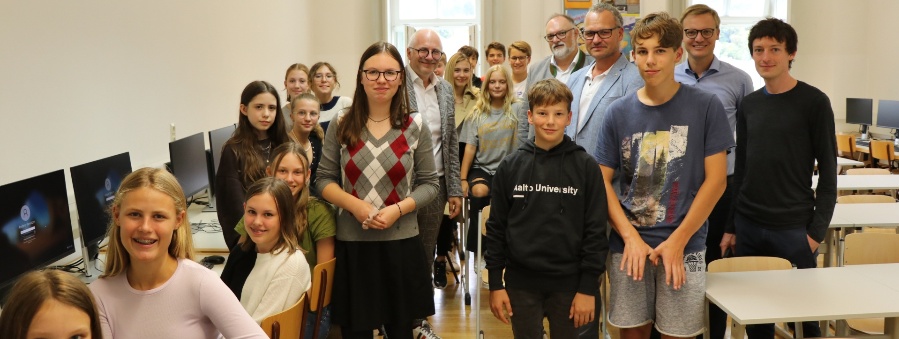 Oberbürgermeister Jürgen Dupper (hinten in der Mitte), Schulleiter Markus Birner (hinten links) und Projektkoordinator Jörg Hachmeier vom städtischen Hauptamt (hinten rechts) machten sich im Beisein von Schülern und Lehrern einen Überblick über das neue Projekt am Gymnasium Leopoldinum.