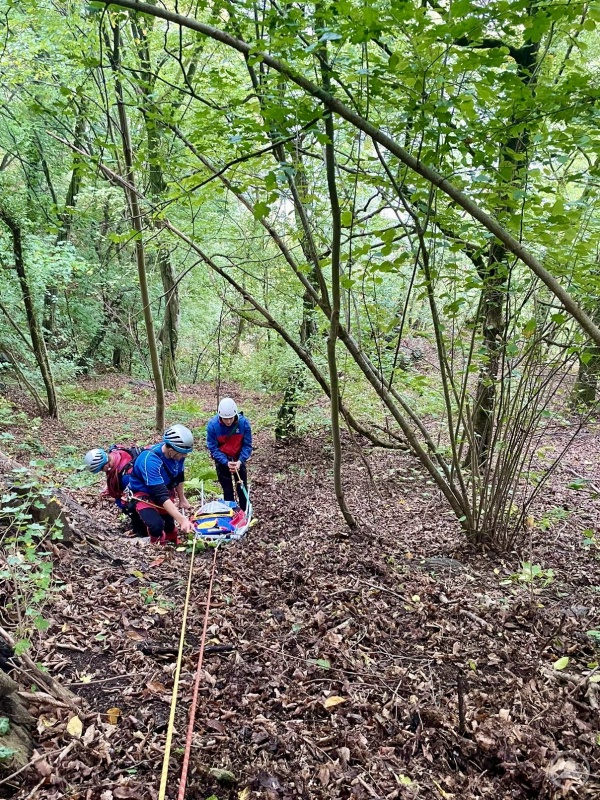 Nach einer kurzen Mittagspause erfolgte dann die Alarmierung zu einer kleinen Einsatzübung mit dem Meldebild einer abgestürzten Person am unteren Längsweg. Sofort machte sich ein Trupp auf dem Weg, um die Lage vor Ort festzustellen und dem Einsatzleiter mitzuteilen. Im Anschluss daran wurde gleich einer der Bergretter zu der Verletzten abgelassen um sie erstzuversorgen. Die nachrückende Mannschaft transportierte in der Zwischenzeit das benötigte Material für einen schonenden Abtransport zur Einsatzstelle und baute den Statikseilsatz auf. Die Patientin wurde daraufhin von zwei Bergrettern begleitet mittels eines Flaschenzuges zurück nach oben auf den Weg transportiert, wo die Übung endete.