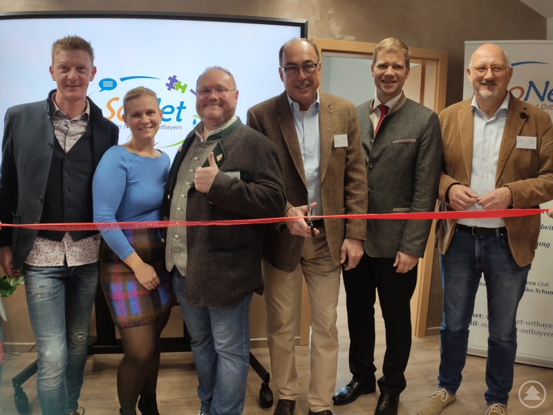 v.l.: Geschäftsführung SoNet: Christoph Liebl, Verena Liebl, Heiko Schumann, stellv. Landrat Franz Brunner, Bezirkstagspräsident Dr. Olaf Heinrich, Landtagsabgeordneter Manfred Eibl