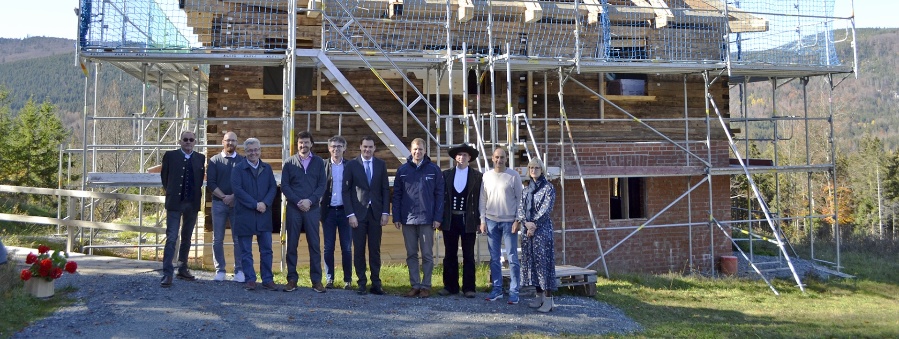 Am Kirchweihmontag fand das Richtfest des Paul-Friedl-Geburtshauses im Freilichtmuseum Finsterau statt. Verbandsvorsitzender und Bezirkstagspräsident Dr. Olaf Heinrich begrüßte dazu neben Landrat Sebastian Gruber, dem Ersten Bürgermeister der Gemeinde Mauth, Ernst Kandlbinder auch Roland Pongratz, der sich für die Paul-Friedl-Ausstellung verantwortlich zeichnet. Zudem waren Museumsleiter Timm Miersch, Mitarbeiter des Freilichtmuseums und die am Bau beteiligten Planer sowie die ausführende Zimmerei mit ihrem Team zugegen.