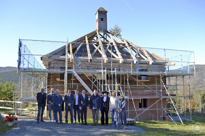 Freuen sich über den zügigen Baufortschritt am Paul-Friedl-Geburtshaus im Freilichtmuseum Finsterau: (v.l.) Geschäftsführer des Bau- und Zimmereiunternehmens Heinz Strobl, Statiker Manfred Barth, Architekt Norbert Paukner, Leiter Baureferat des Bezirks Niederbayern Matthias Kopf, Geschäftsleiter des Zweckverbandes Niederbayerische Freilichtmuseen Thomas Klement, Landrat Sebastian Gruber, Bezirkstagspräsident und Vorsitzender des Zweckverbandes Dr. Olaf Heinrich, Museumsleiter Timm Miersch, Bürgermeister der Gemeinde Mauth Ernst Kandlbinder und Betriebsleiterin des Freilichtmuseums Finsterau Stephanie Herzig.