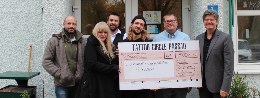 Das Studio „Tattoo-Circle Passau“ hat 500 Euro für die donauhof-werkstätten der Caritas gespendet. Robert Seidl kam gerne in die Einrichtung für Menschen mit Behinderung, um den Scheck zu überreichen. Schließlich war er Anfang der 2000er Jahre als Zivildienstleistender in der Schreinerei und im Lager der Caritas-Werkstätten im Einsatz. Zum wiederholten Mal stellt Tattoo-Circle Passau caritativen Einrichtungen wie der Bahnhofsmission Spenden zur Verfügung.