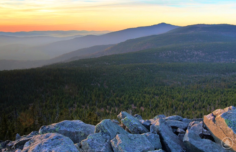 Die schönen Oktobertage boten in der verganegen Woche vor allem auf den Bayerwaldbergen wunderschöne Ausblicke. Das Foto zeigt eine herbstliche Lichtstimmung zum Sonnenuntergang am Lusengipfel mit seinen zerklüfteten Felsblöcken. Die Sicht geht über die Höhen des Plattenhausenriegels zum Großen Rachel (1453 m) abends kurz nach 18.00 Uhr.