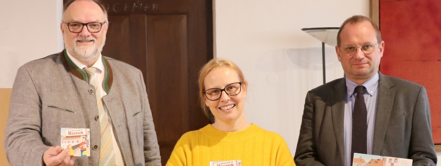Oberbürgermeister Jürgen Dupper (von links), Museumsleiterin Dr. Stefanie Buchhold und Kulturreferent Dr. Bernhard Forster zeigen sich erfreut über das exklusive Pixi-Buch mit einer spannenden Geschichte zum Oberhausmuseum.