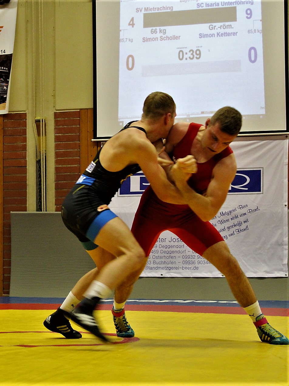 - 66 kg – gr.: Im letzten Kampf vor der Pause trafen mit Simon Scholler (M) und Simon Ketterer zwei Athleten aufeinander, die sich währen der gesamten Kampfzeit auf Augenhöhe auseinandersetzten. Mit einem Kraftakt in der letzten Minute drehte der Mietrachinger, bei einem 1:3-Rückstand, noch das Kampfgeschehen und landete dadurch einen knappen Sieg.