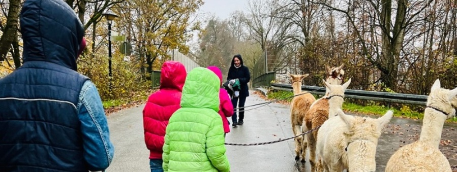 Auch der Regen nahm den Kindern die Begeisterung an der kleinen Alpakawanderung nicht.