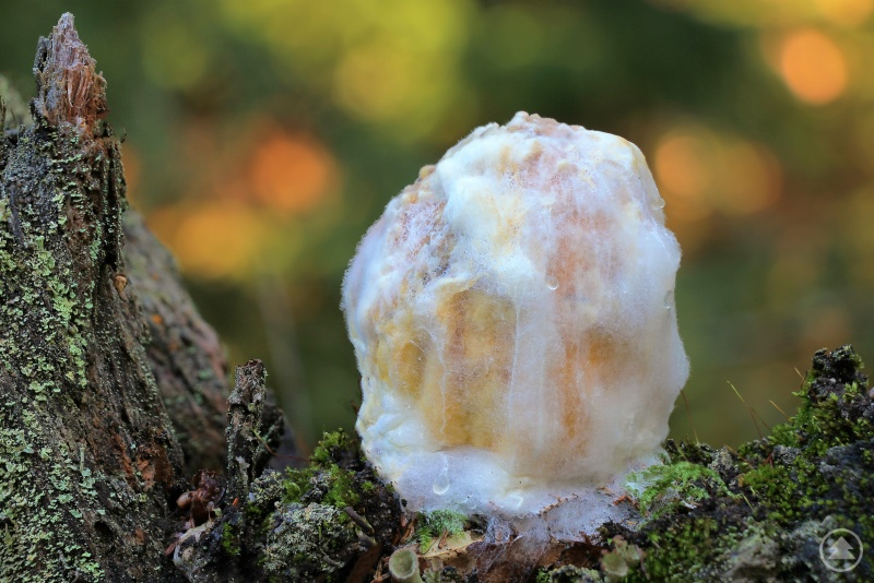 Auf dem Sommerweg zum Lusen, noch unterhalb der Himmelsleiter stand dieses außerordentliche Naturgebilde (siehe Foto). Es wuchs unförmig auf einem vermodernden Baumwurzelgebilde von Fichtenresten. Ein wucherndes weiß-gelbliches Pilzgeflecht breitet sich schleierartig aus und umschließt dabei einen maroden, zerfallenden Hutpilz, er frisst ihn sozusagen auf. Dabei entzieht er ihm Nährstoffe und Wasser und sichert auf diese Weise sein Überleben. Parasitentum gibt es oftmals in der Natur, wobei das eine Wesen Nutzen für sich zum Schaden des anderen zieht. Der Bayerwald-Pilzexperte Peter Karasch kann das versteckte Gebilde im Inneren nicht mehr bestimmen, „da müsste man ihn vor Ort aufschneiden“! Das sichtbare äußere Pilzwesen, das sich im bemoosten Gehölz mit seinem Myzel fest verankert hat, sah einem kleinen Leuchtkörper gleich. Seine Bemantelung besteht aus unzähligen dünnen Fasern, die sich netzförmig ausdehnen. vermutlich eines hellen Schimmelpilzes. Karasch meint, es handle sich um einen Schimmelpilz, es könnten aber auch andere „pilzliche Hyperparasiten“ sein. Darunter versteht man Parasiten, die ihrerseits wieder Parasiten besiedeln. Auf jeden Fall sitzt in dem Exemplar im Bild ein Pilz auf einem Pilz (fungicoler Pilz), der radikal über ihn hergefallen ist. E sieht märchenhaft aus, ist farblich interessant und stellt für den Betrachter ein seltenes Naturschauspiel dar, das man in dieser Form in unseren Wäldern eher selten antrifft.