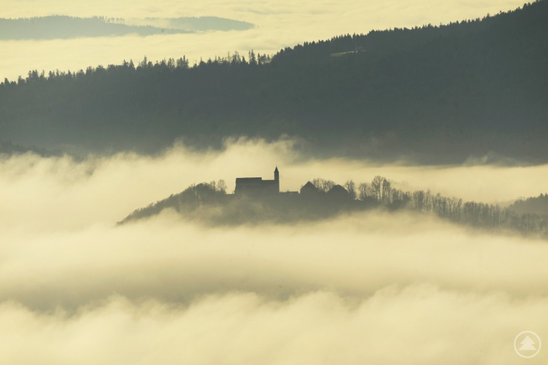 Die Pfarrkirche "St. Ägidius" von Wollaberg bei Jandelsbrunn ragt aus den wabernden Herbstnebeln heraus. Sie liegt auf einem Inselberg in etwa 730 m Seehöhe und grüßt weit ins Land hinaus.