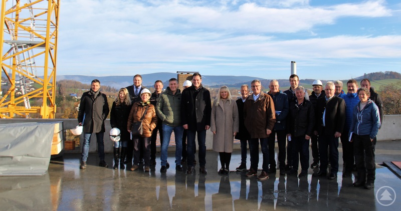 Damit sie sich ein Bild vom aktuellen Stand der Baumaßnahme machen können, hatte Landrat Sebastian Gruber (8.v.li.) Schulleiterin Elvira Wudy-Engleder (daneben rechts) und die Mitglieder des Bauausschusses zur jüngsten Sitzung ins Berufliche Schulzentrums nach Waldkirchen eingeladen. Dabei konnten sie auch den Weitblick vom noch nicht überdachten Dachgeschoss bewundern. Anfang Dezember soll der Dachstuhl bereits stehen und dann bald auch alle weiteren Maßnahmen erfolgen, um den neuen Gebäudeteil noch vor Jahressende „dicht“ zu bekommen.