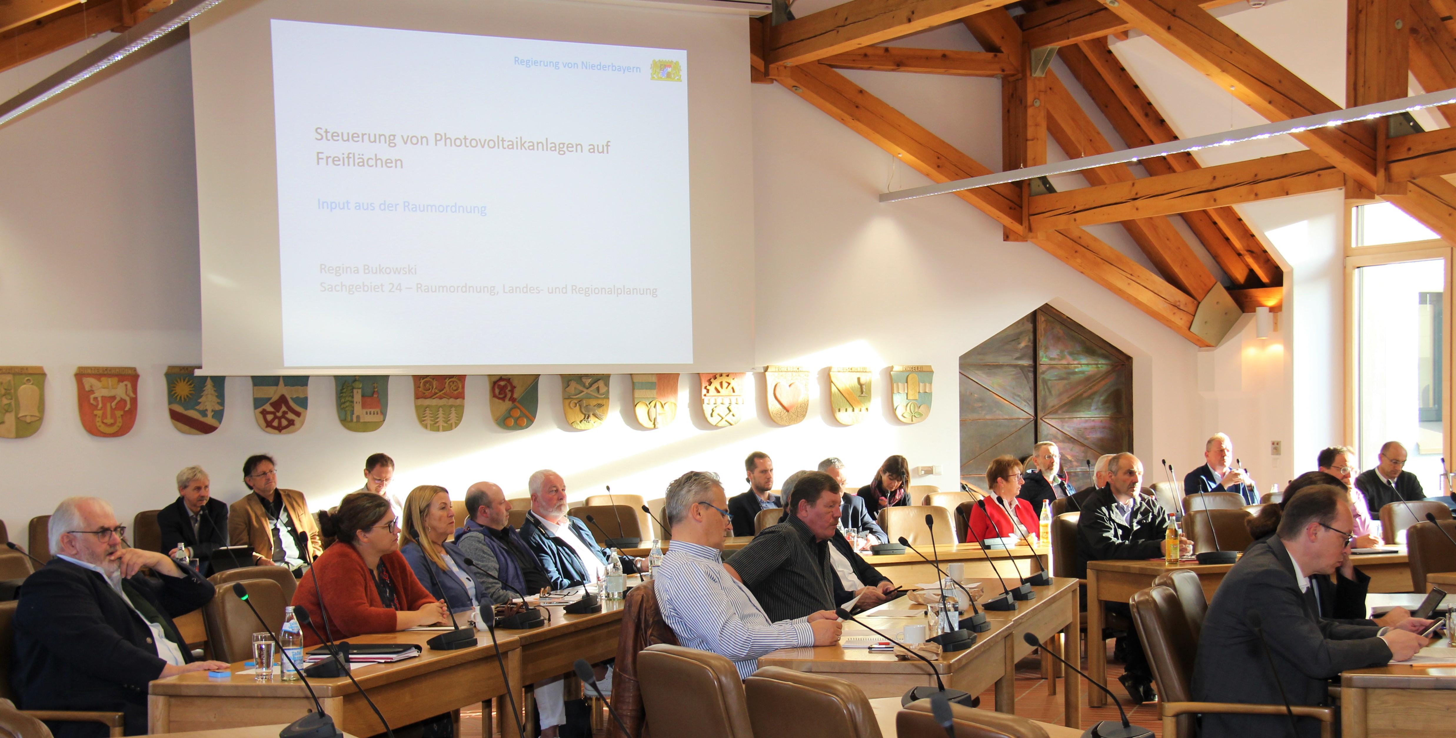 Für das Sachgebiet Raumordnung sowie Landes- und Regionalplanung der Regierung von Niederbayern referierte Regina Bukowski über die Steuerung von Photovoltaikanlagen auf Freiflächen. Ein wichtiges Thema, zumal ein weiterer Zubau sowohl in Bezug auf die Anlagenzahl sowie Anlagengröße zu erwarten sei. Die Kommunen seien deshalb einer hohen Anzahl von Ansiedlungswünschen ausgesetzt. Laut Landesentwicklungsprogramm Bayern (LEP) sind erneuerbare Energien verstärkt zu erschließen und zu nutzen. Dies betrifft auch Freiflächen-Photovoltaikanlagen. Dennoch sieht neben dem LEP auch der Regionalplan Donau-Wald vor, dass die Errichtung von PV-Anlagen raumverträglich erfolgen soll, d.h. dass z.B. die Erholungslandschaften im Bayerischen Wald sowie Landschaftsstrukturen zu sichern und zu pflegen sind. Das hat zur Folge, dass einerseits Schutzgebiete erhalten und ggf. sogar ausgebaut und andererseits die vorhandenen Potenziale für erneuerbare Energien in der Region erschlossen werden sollen.