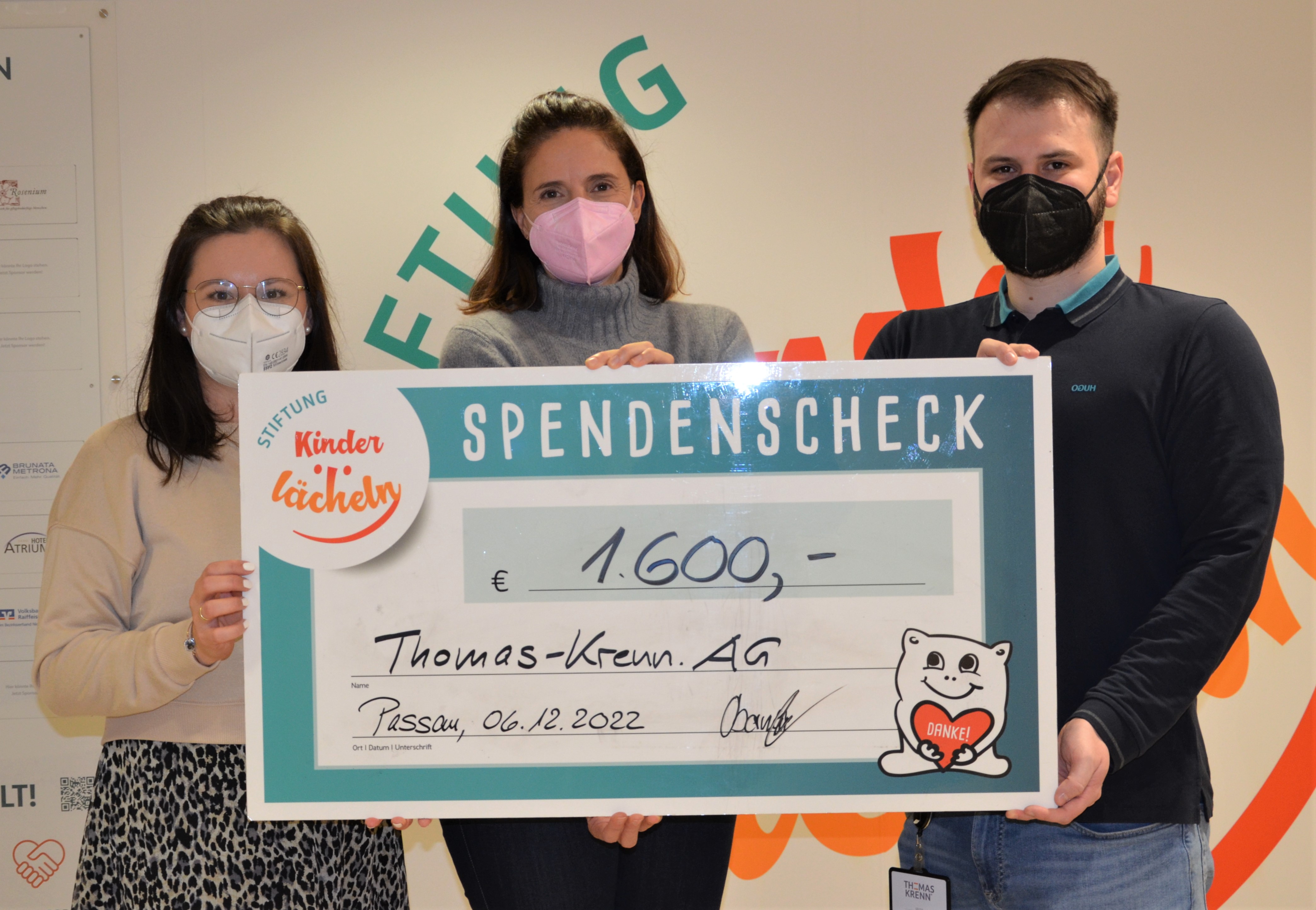 Steffi Graf (l.) und Thomas Obermüller (r.) von der Thomas-Krenn.AG mit Sitz in Freyung, übergeben die Spendensumme in Höhe von 1.600 Euro an die Stiftungsvorstandsvorsitzende Dr. Maria Diekmann (Mitte).