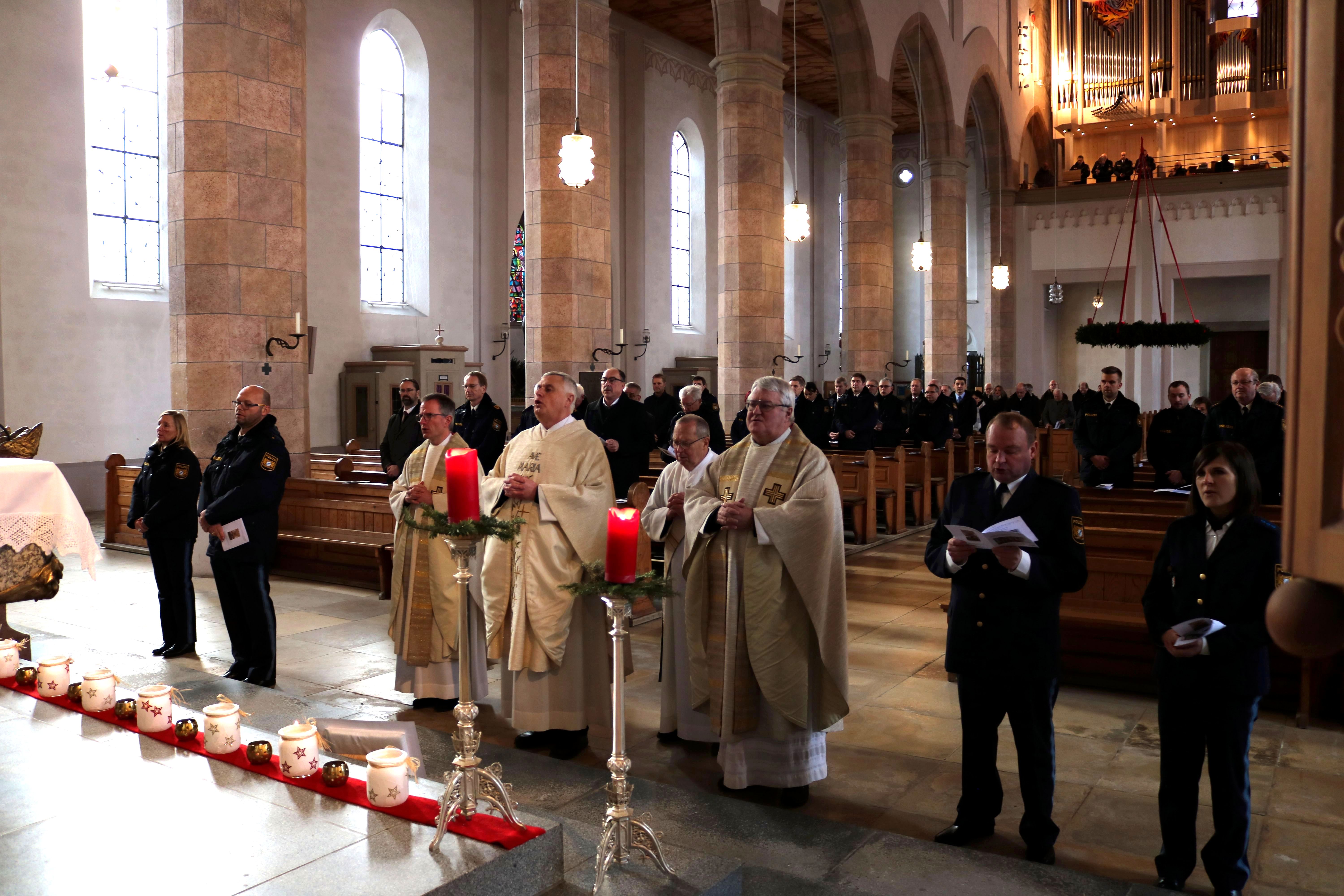 Am Mittwoch, den 08.12.2022, feierten über 100 Kolleginnen und Kollegen des Polizeipräsidiums Niederbayern zusammen mit Dompropst Msgr. Dr. Michael Bär, den Polizeiseelsorger der Diözese Passau und den Konzelebranten, Stadtpfarrer Michael Nirschl, Polizeiseelsorger Karl-Dieter Schmidt, sowie Diakon Paul Schmidt, den traditionellen Gottesdienst in der Stadtpfarrkirche St. Peter und Paul in Waldkirchen. Pandemiebedingt konnte dieser in den letzten beiden Jahren leider nicht stattfinden, daher war es umso erfreulicher wieder in diesem besinnlichen Rahmen das Jahr 2022 Revue passieren lassen zu können. Die Gestaltung, sowie die musikalische Umrahmung des Gottesdienstes, wurde im prachtvollen „Bayerwald-Dom“ vom Bläserensemble des Polizeipräsidiums Niederbayern und dem Polizeichor Pfarrkirchen übernommen. Auch die musikalische Begleitung durch den Kantor und den Organisten, sowie der liturgische Dienst konnte durch engagierte Kolleginnen und Kollegen aus den Reihen der niederbayerischen Polizei gestellt werden.