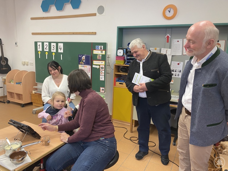 Regionaler Verkaufsberater Ernst Zimmermann (li.) und Franz Plattner, der Verkaufsleiter Innstolz Frischdienst Rotthalmünster/Deggendorf, beobachten die kleine Theresa, wie sie mit einem Talker kommuniziert und unter Anleitung des Personals der Don Bosco-Schule Trinkschokolade herstellt. Mit 1000 Euro unterstützen sie Kinder und Jugendliche mit körperlichen Behinderungen.
