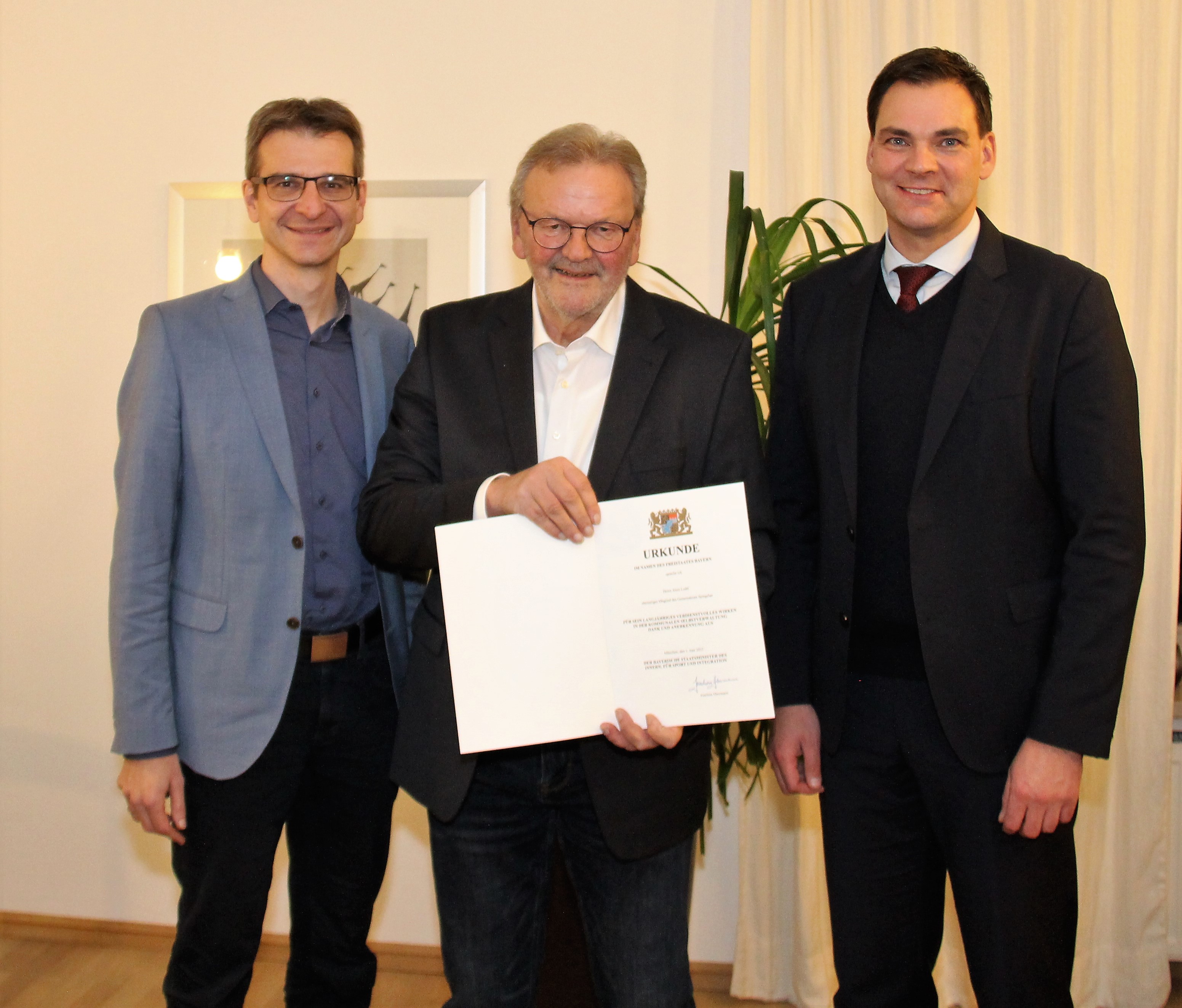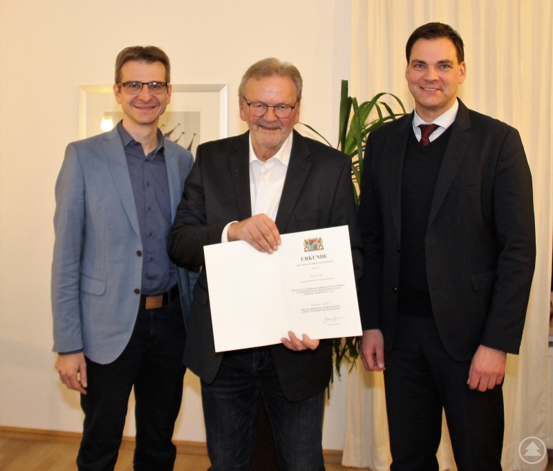 18 Jahre war Alois Loibl im Gemeinderat der Gemeinde Spiegelau tätig. Für seine langjährigen Verdienste um die kommunale Selbstverwaltung hat der der Bayerische Staatsminister des Innern, für Sport und Integration, Joachim Herrmann, ihn mit der Kommunalen Dankurkunde ausgezeichnet. Im Auftrag des Ministers oblag es Herrn Landrat Sebastian Gruber, diese Auszeichnung - im Beisein von Spiegelaus Bürgermeister Karlheinz Roth, einem langjährigen Weggefährten - auszuhändigen. Als „pflichtbewusstes Mitglied des Gemeinderates Spiegelau“, so Gruber, habe Loibl „maßgeblich an der positiven Weiterentwicklung der Gemeinde mitgewirkt“. Gruber fügte zudem an, dass Alois Loibl „das Ohr stets nahe an der Bevölkerung hatte und - über seine Tätigkeit im Gemeinderat hinaus - sich vielfältig im Ehrenamt und für seine Heimatgemeinde engagierte.“