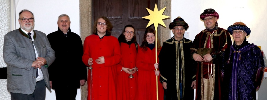 v.l.: Oberbürgermeister Jürgen Dupper mit Dompropst Dr. Michael Bär, einer Gruppe von Domministranten sowie Konrad Mader, Dr. Roland Feucht und Max Absmeier als Heilige Drei Könige.