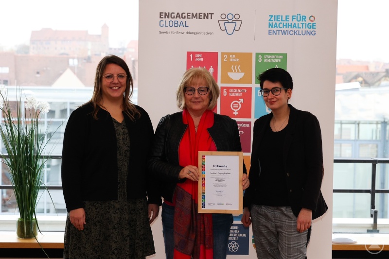 Ramona Rid (Projektleiterin SKEW) (v.l.) überreichte der stellvertretenden Landrätin des Landkreises Freyung-Grafenau Helga Weinberger und Nina Stelzl, die für die Umsetzung der Nachhaltigkeitsstrategie verantwortlich ist, die Auszeichnung zur “Global Nachhaltigen Kommune”.