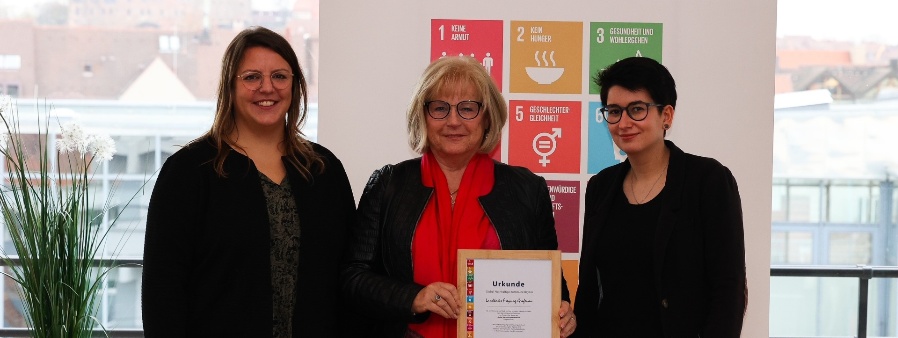 Ramona Rid (Projektleiterin SKEW) (v.l.) überreichte der stellvertretenden Landrätin des Landkreises Freyung-Grafenau Helga Weinberger und Nina Stelzl, die für die Umsetzung der Nachhaltigkeitsstrategie verantwortlich ist, die Auszeichnung zur “Global Nachhaltigen Kommune”.