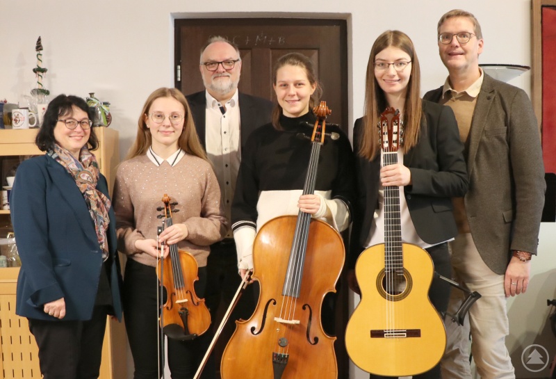 Über den gelungenen Auftritt von Violinistin Sophie Schachner (2. von links), Cellistin Johanna Roßmeier (4. von links) und Gitarristin Johanna Keilhofer (2. von rechts) freuen sich Oberbürgermeister Jürgen Dupper (3. von links), Schulleiter Johannes Fuchs (rechts) und die Betreuerin der Fachschaft Musik Brigitte Glas (links).