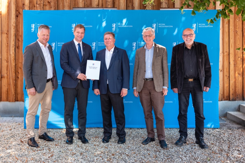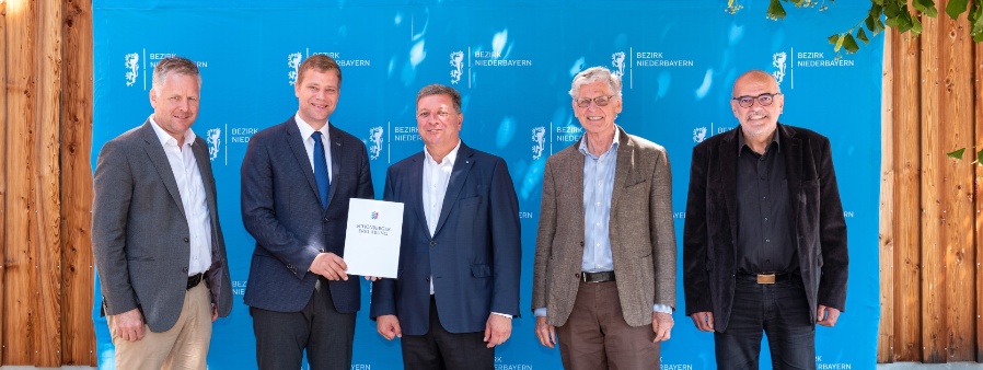 Das Bild zeigt den Bayerischen Staatsminister für Wohnen, Bau und Verkehr, Christian Bernreiter (3. v. l.), am 16. Juli 2022 bei der Entgegennahme der „Schönberger Erklärung“ von Bezirkstagspräsidenten Dr. Olaf Heinrich (2. v. l.) und Dr. Rudolf Neumaier, Geschäftsführer des Bayerischen Landesvereins für Heimatpflege e. V. (links) sowie den Architekten und Stadtplanern Manfred Brennecke (2. v. r.) und Jakob Oberpriller (rechts).