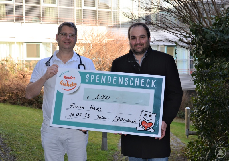 Der Röhrnbacher Unternehmer Florian Haidl übergibt eine Privatspende in Höhe von 1.000 Euro an Kinderklinik-Chefarzt Prof. Dr. Matthias Keller zu Gunsten der Stiftung Kinderlächeln.