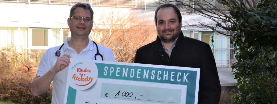 „Diese Spende war mir einfach ein Herzensanliegen“, so Florian Haidl, der selbst zweifacher Familienvater ist. Man komme nicht umher von der schwierigen Lage der Kliniken in diesen Zeiten zu hören – „und wenn man die Möglichkeit hat, regional zu helfen, dann will ich diese gern ergreifen“, übergibt er den Spendenscheck über 1.000 Euro zu Gunsten der Stiftung Kinderlächeln stellvertretend an Kinderklinik-Chefarzt Prof. Dr. Matthias Keller.