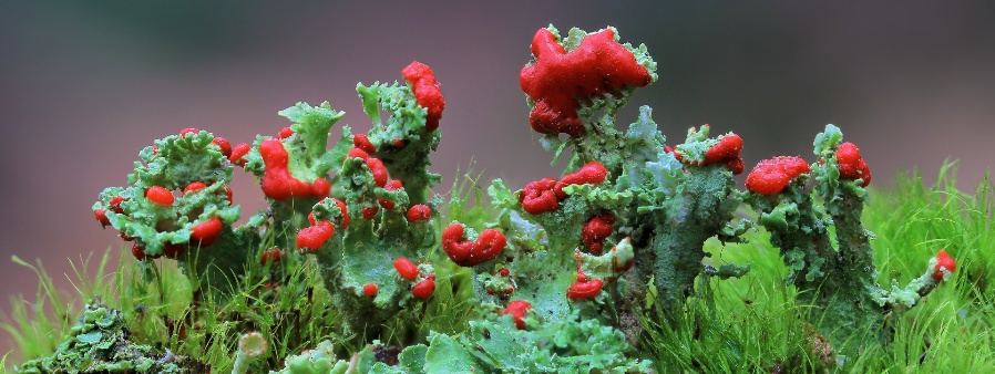 In Vergleich zu bunten Blumen und Blütengewächsen zeigen sich die meisten Flechten in unseren Wäldern als unscheinbare und unauffälllige Wesen. In ihren gedämpften Grünfarben stechen sie nicht besonders ins Auge, da bei ihrer Färbung auch grün-bläuliche oder grün-graue Töne mitmischen. Nur einige „Cladonia-Arten“ bilden am obenern Ende Fruchtkörper aus, die scharlachrot strahlen und besondere Aufmerksamkeit erregen. Eine Ausnahme bildet auch die „Gelbe Schüsselflechte“, die sich an Sträuchern in einem gelb-orangen „Outlook“ präsentiert.