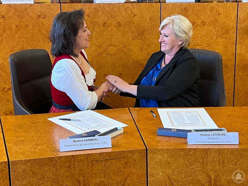 Bezirksrätin Martina Hammerl und die Präsidentin des Conseil départemental de l’Oise, Nadège Lefebvre, erneuerten die Partnerschaftsurkunde anlässlich des 30-jährigen Jubiläums der Regionalpartnerschaft.