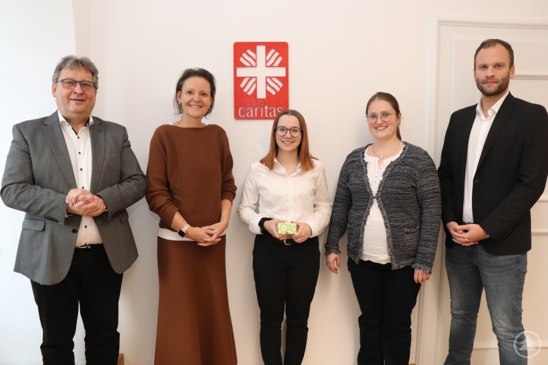 Mit großem Erfolg hat Selina Wilhelm (Mi.) die Ausbildung bei der Caritas abgeschlossen. V.li.) Die Caritasvorstände Diakon Konrad Niederländer und Diözesan-Caritasdirektorin Mag.a (FH) Andrea Anderlik, MSc, Fachbereichsleiterin Personalbetreuung Astrid Frauenauer und Thomas Furthmeier, Leiter der Personalabteilung, gratulierten.