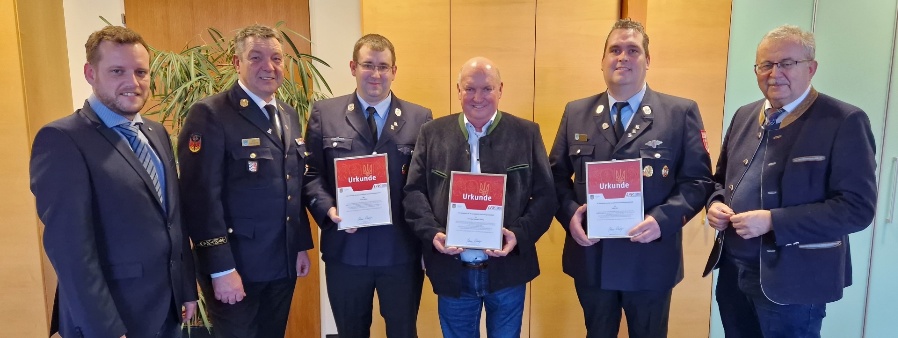 Landrat Josef Laumer dankte den beiden Feuerwehrlern und würdigte das außerordentliche ehrenamtliche Engagement: „Für alle Herausforderungen, die sich momentan leider überschlagen, brauchen wir Solidarität und Zusammenhalt, wie wir sie immer wieder auf beeindruckende Art und Weise bei unseren Einsatzorganisationen, vor allem bei unseren Freiwilligen Feuerwehren finden.“ Ein besonderer Dank galt auch dem anwesenden Leiblfinger Bürgermeister Josef Moll, der Einsätzen in Katastrophensituationen stets schnell und unbürokratisch zustimmt.