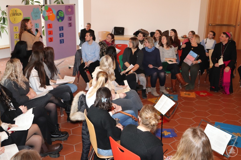 Für die Studierenden war der persönliche Austausch mit Bischof Oster das Highlight des Tages. Sie fragten ihn zusammen mit der Schulleiterin Andrea Feitz zu seinem persönlichen Glauben, zur Sinnfrage und zum Umgang mit dem Tod, zur Wertevermittlung für die jungen Menschen. Aber auch Problemfelder wie der schwindende Glaube in der Jugend wurden benannt. Bischof Oster antwortete sehr persönlich aus einer eigenen Glaubens- und Lebenserfahrung. Zentraler Rat des Bischofs: Begegnungen schaffen, damit Menschen erfahren, dass Jesus lebt, dass jeder eine persönliche Beziehung zu Christus aufbauen und sein Leben verändern könne. Zum Abschluss feierte der Bischof mit den Studierenden eine Andacht und segnete die Schulkreuze.