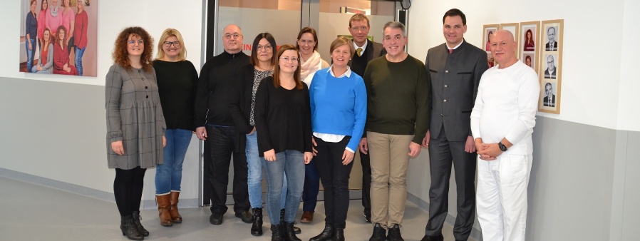 v. links: Katharina Schuster, Sylvia Stöckl, Belegarzt MUDr. Michal Mares, Petra Heinrich, Julia Hofmaier, Julia Hoffmann, Vera Seipelt, Geschäftsführer Marcus Plaschke, Belegarzt Dr. Bernhard Rabenbauer, Landrat Sebastian Gruber und Belegarzt Dr. (H) Zoltan Bogner; die zwei Hebammen Michaela Schreib und Melanie Spitzenberger-Schwope fehlen auf dem Bild.