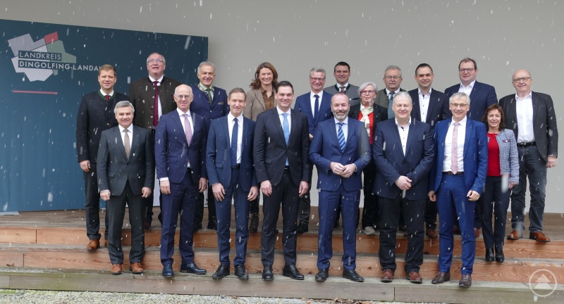 Mit den Niederbayerischen und Oberpfälzer Landräten kam der Schnee in den Landkreis Dingolfing-Landau – im Bild vorne der Ehrengast und Referent der Arbeitstagung, MdEP Manfred Weber (vorne, 3.v.r.), die Bezirksvorsitzenden des Bayerischen Landkreistages, Landrat Sebastian Gruber für Niederbayern (vorne Mitte) und Landrat Richard Reisinger für die Oberpfalz (2.v.r) sowie der gastgebende Landrat Werner Bumeder (rechts)