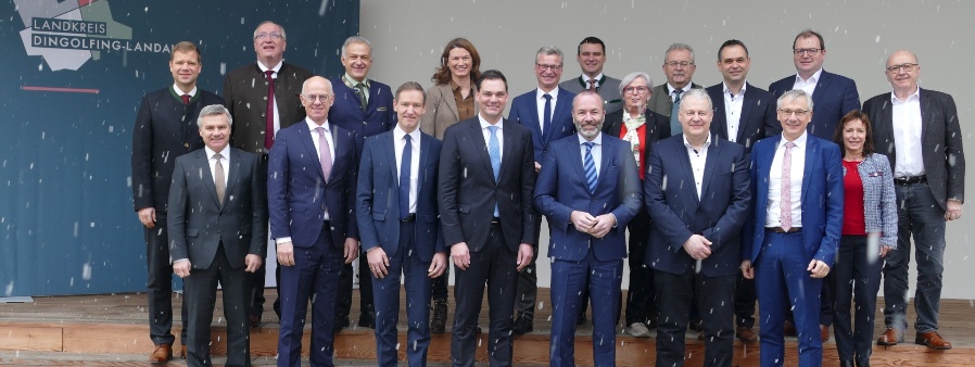 Mit den Niederbayerischen und Oberpfälzer Landräten kam der Schnee in den Landkreis Dingolfing-Landau – im Bild vorne der Ehrengast und Referent der Arbeitstagung, MdEP Manfred Weber (vorne, 3.v.r.), die Bezirksvorsitzenden des Bayerischen Landkreistages, Landrat Sebastian Gruber für Niederbayern (vorne Mitte) und Landrat Richard Reisinger für die Oberpfalz (2.v.r) sowie der gastgebende Landrat Werner Bumeder (rechts)