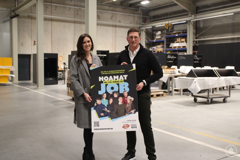 Verena Six, Pullman City, und Matthias Kainz, metron eging GmbH, präsentieren als Hauptorganisatoren das Plakat der HoamatJob – Messe. Im Hintergrund bereits Fläche auf der später die Aussteller Platz finden werden zu sehen.
