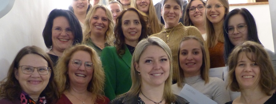 14 Teilnehmerinnen aus Caritas-Kitas und katholischen Einrichtungen haben zur sich erfolgreich zur „Pädagogischen Fachkraft in Kindertageseinrichtungen“ weitergebildet. Die Geschäftsführerin im Verband katholischer Kindertageseinrichtungen Bayern e. V. Dr. Alexa Glawogger-Feucht, und Caritasvorstand Konrad Niederländer haben die Zertifikate überreicht.