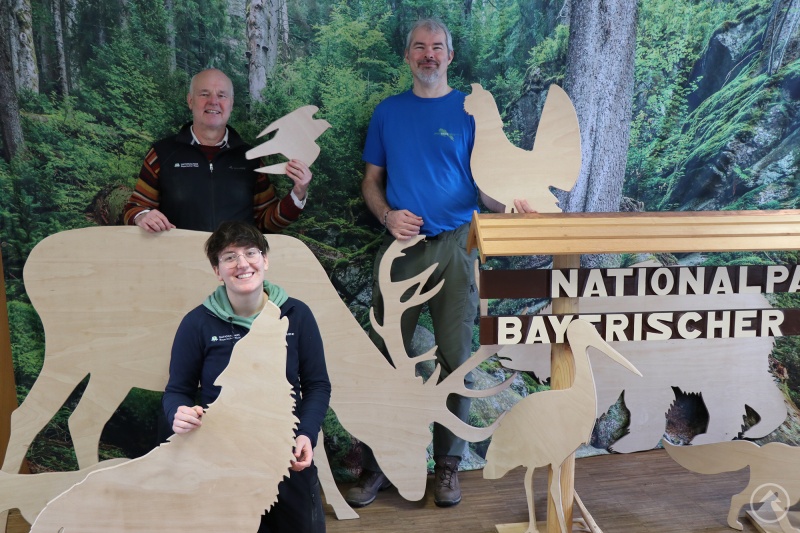 Pavel Becka (r.) hat im Auftrag der Nationalverwaltung Šumava die Tier-Silhouetten aus Holz an Lukas Laux und Sofie Hofbauer, im Nationalpark Bayerischer Wald zuständig für die Landesgartenschau, übergeben. (Foto: Nationalpark Bayerischer Wald)