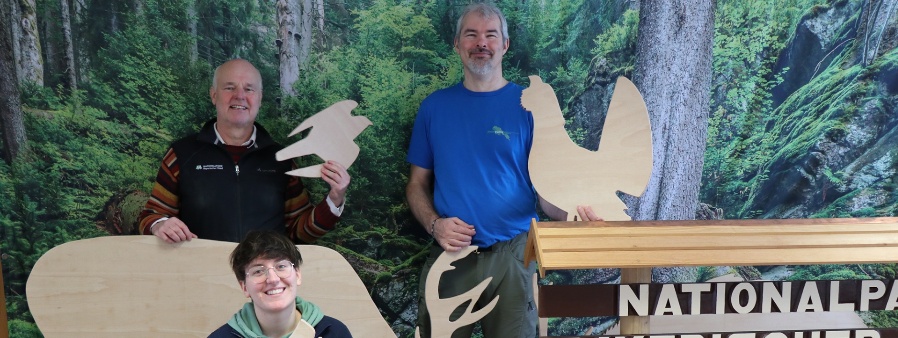Pavel Becka (r.) hat im Auftrag der Nationalverwaltung Šumava die Tier-Silhouetten aus Holz an Lukas Laux und Sofie Hofbauer, im Nationalpark Bayerischer Wald zuständig für die Landesgartenschau, übergeben. (Foto: Nationalpark Bayerischer Wald)